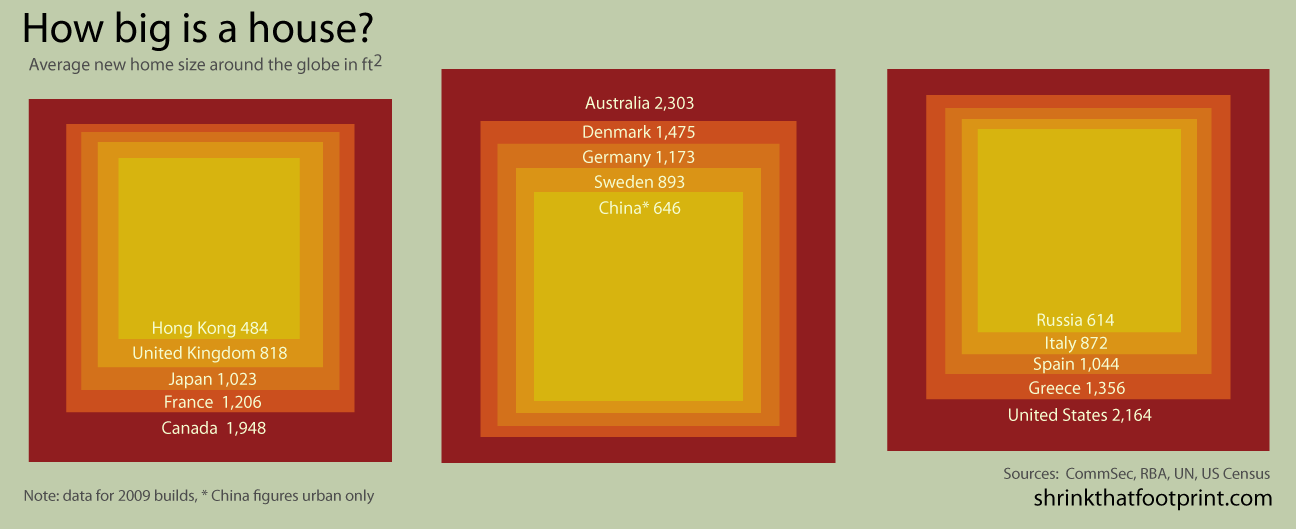 So how does the American home compare to the rest of the world? Not so shockingly, we are space hogs. This great graph from shrinkthatfootprint.com visually exemplifies our cultural desire for more space: