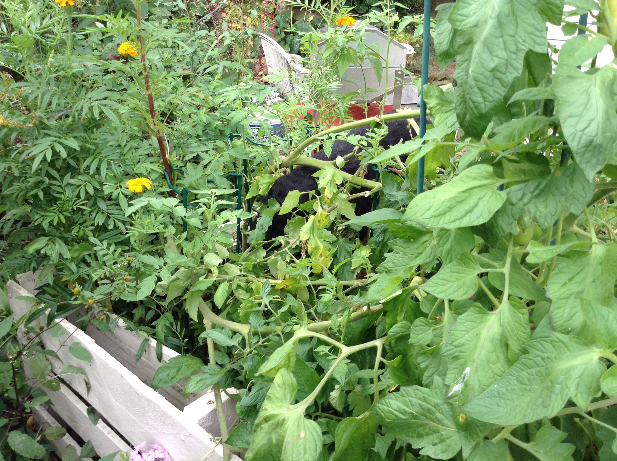 The Jasmanian Devil eating green tomatoes while standing IN the raised garden bed.