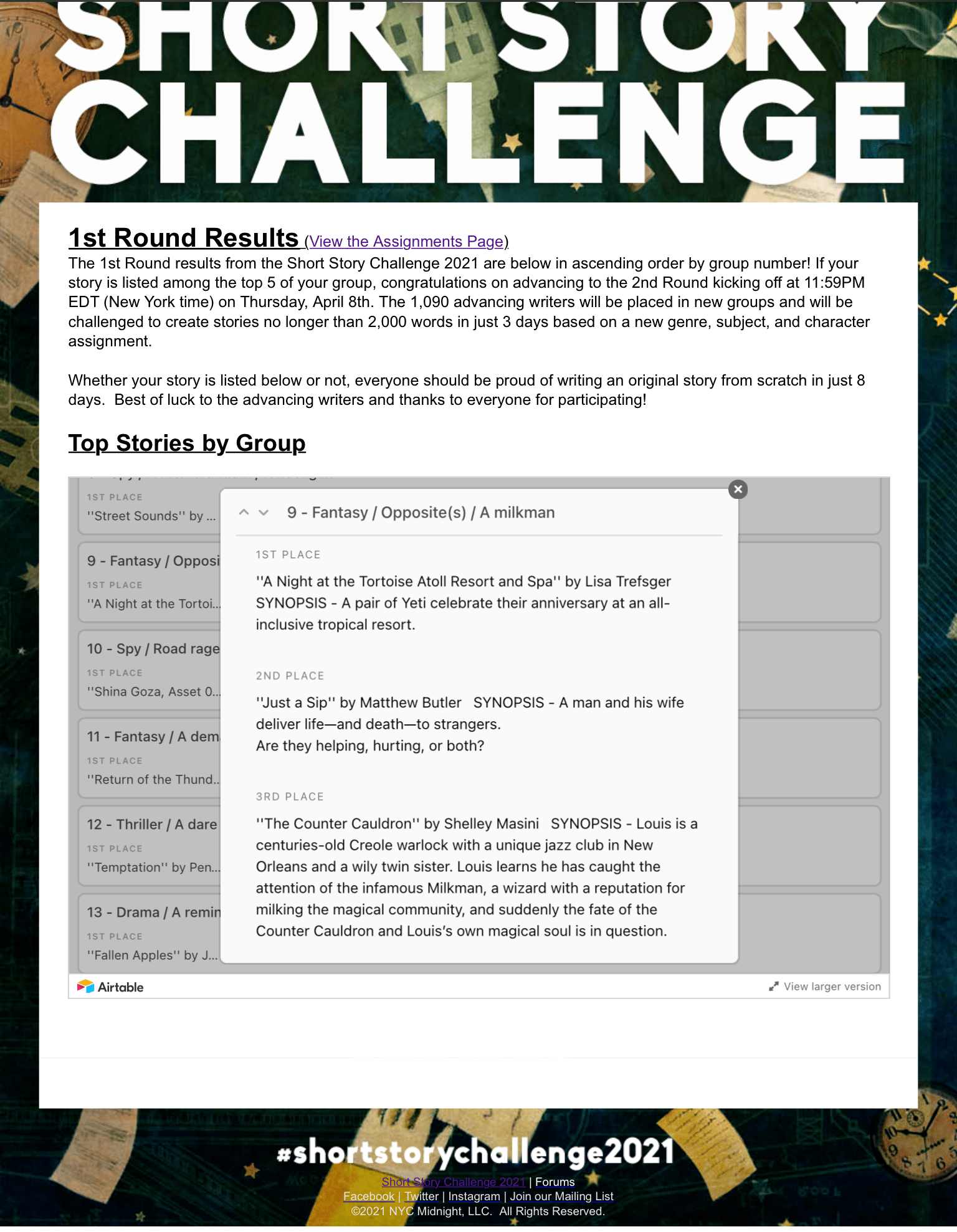 Basically, all the writers were randomly assigned groups, those groups were randomly assigned a genre, a subject, and a character. All writers, in all groups, had the same time and word limit (8 days/2,500 words). I was assigned to Group 9: fantasy, opposites, a milkman. Below is a screen shot of the results for my group. The top 5 writers of each group move on to Round 2.